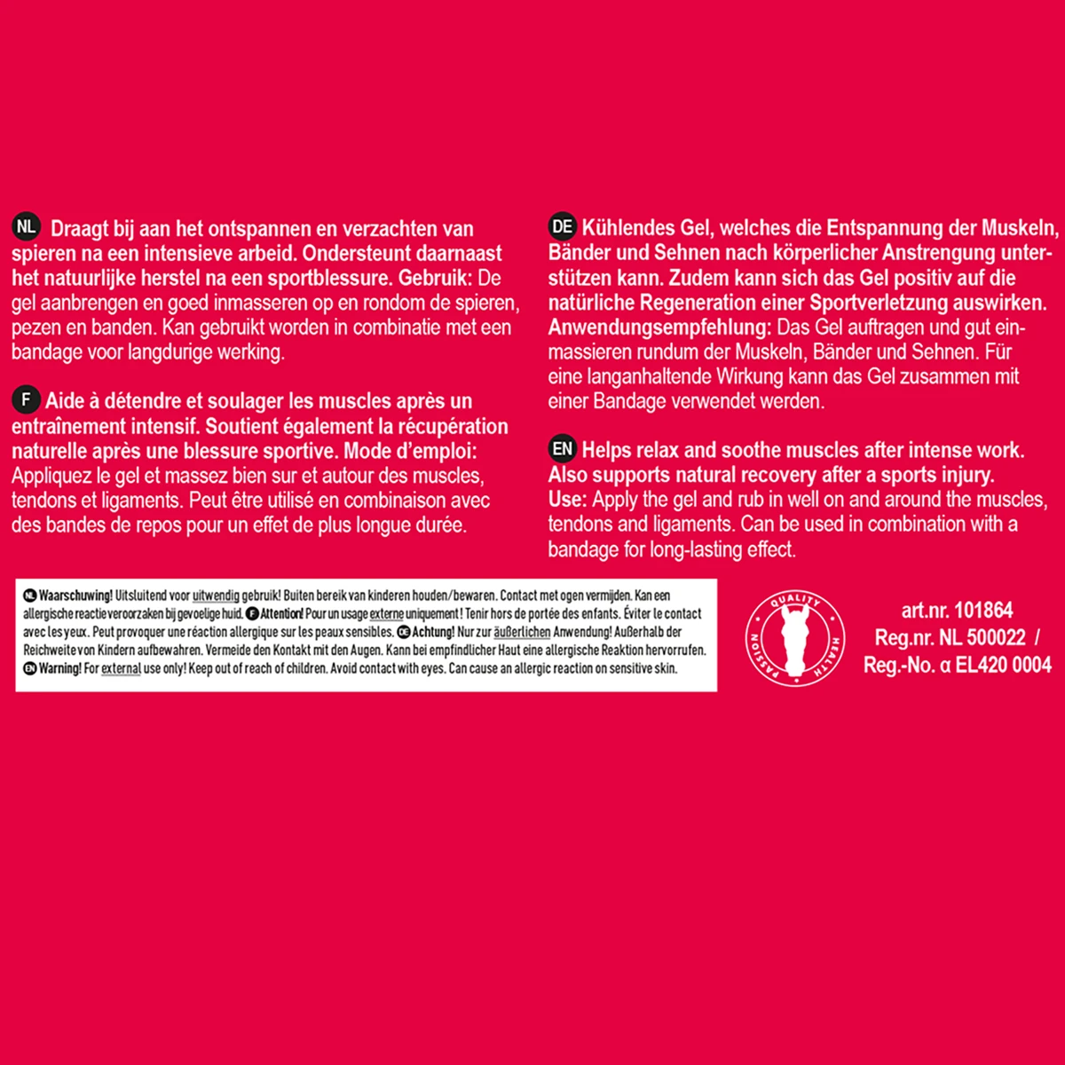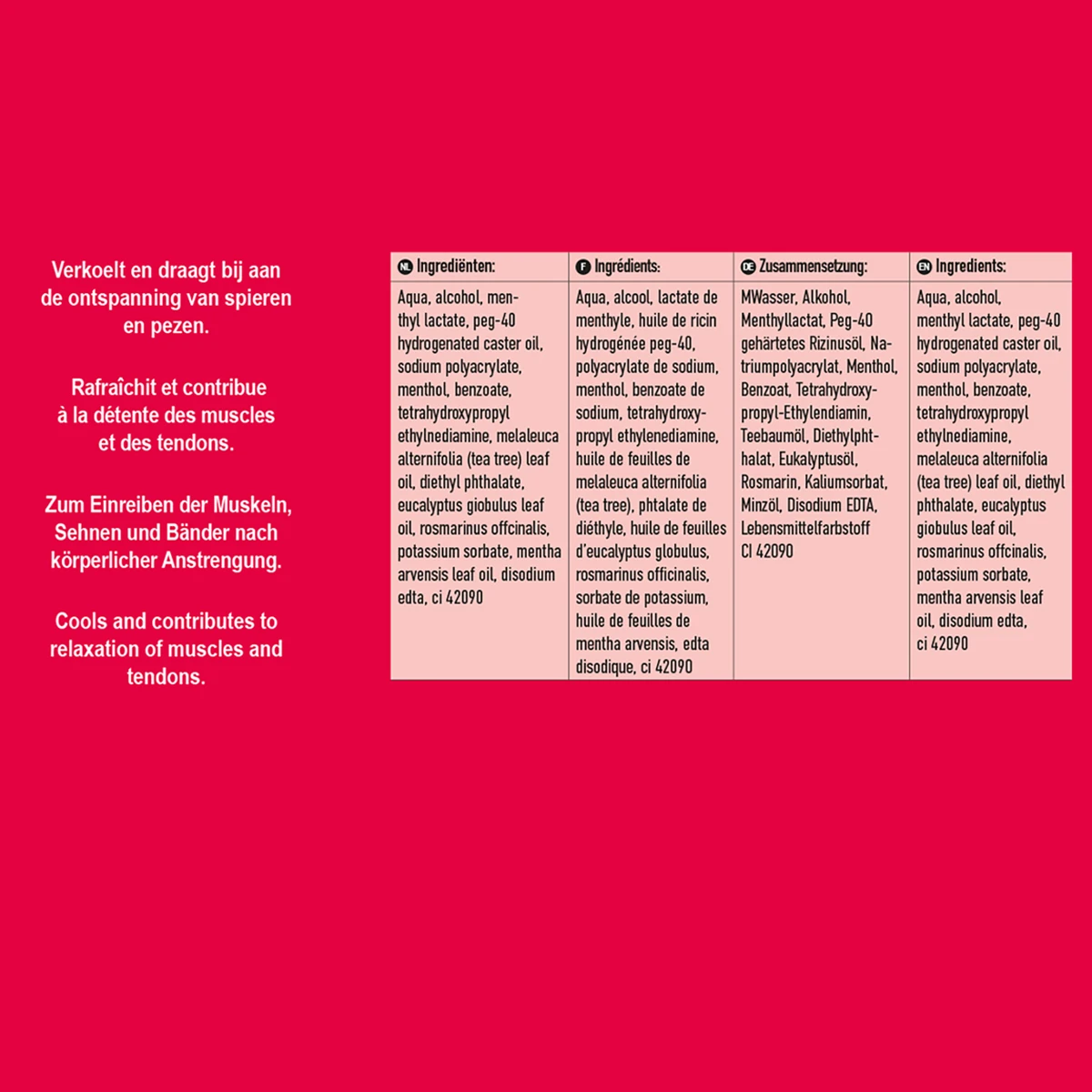 - gel met een verkoelende, ontspannende werking op de spieren, banden, pezen en het totale lichaam na intensieve arbeid