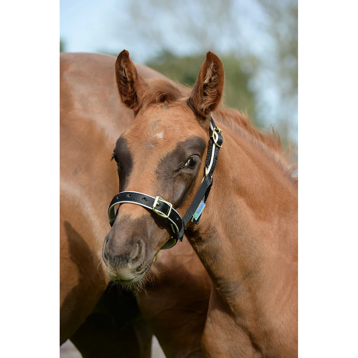 - het halster in maat veulen kan door middel van een gesp versteld worden bij het kopstuk én de neus- en keelriem waardoor dit halster lang met je veulentje mee kan groeien, deze maat heeft geen musketonsluiting bij de keelriem