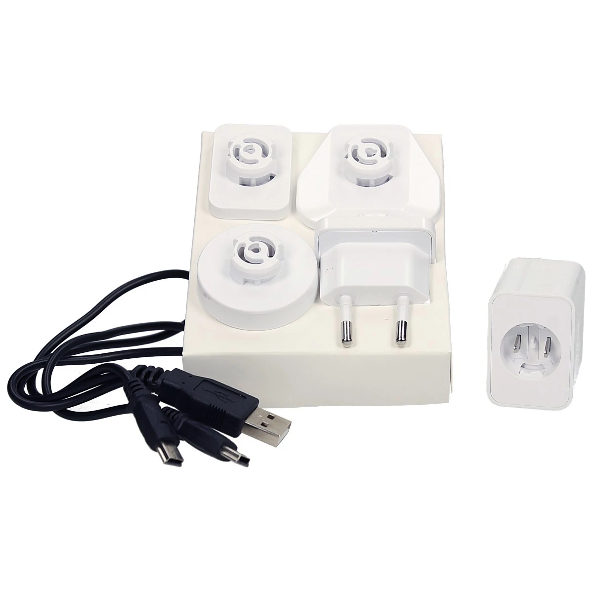 – 1 Oplader met verschillende adapters voor buitenlandse stekkers (kan ook met USB opgeladen worden)