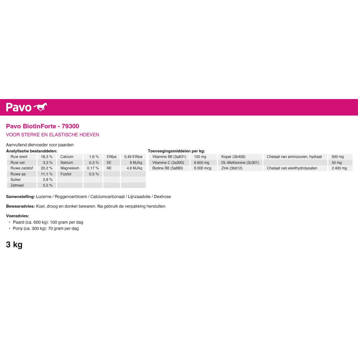 - Pavo BiotinForte bevat biotine (vitamine B8), koper, zink en essentiële aminozuren, om een optimale hoornkwaliteit te ondersteunen