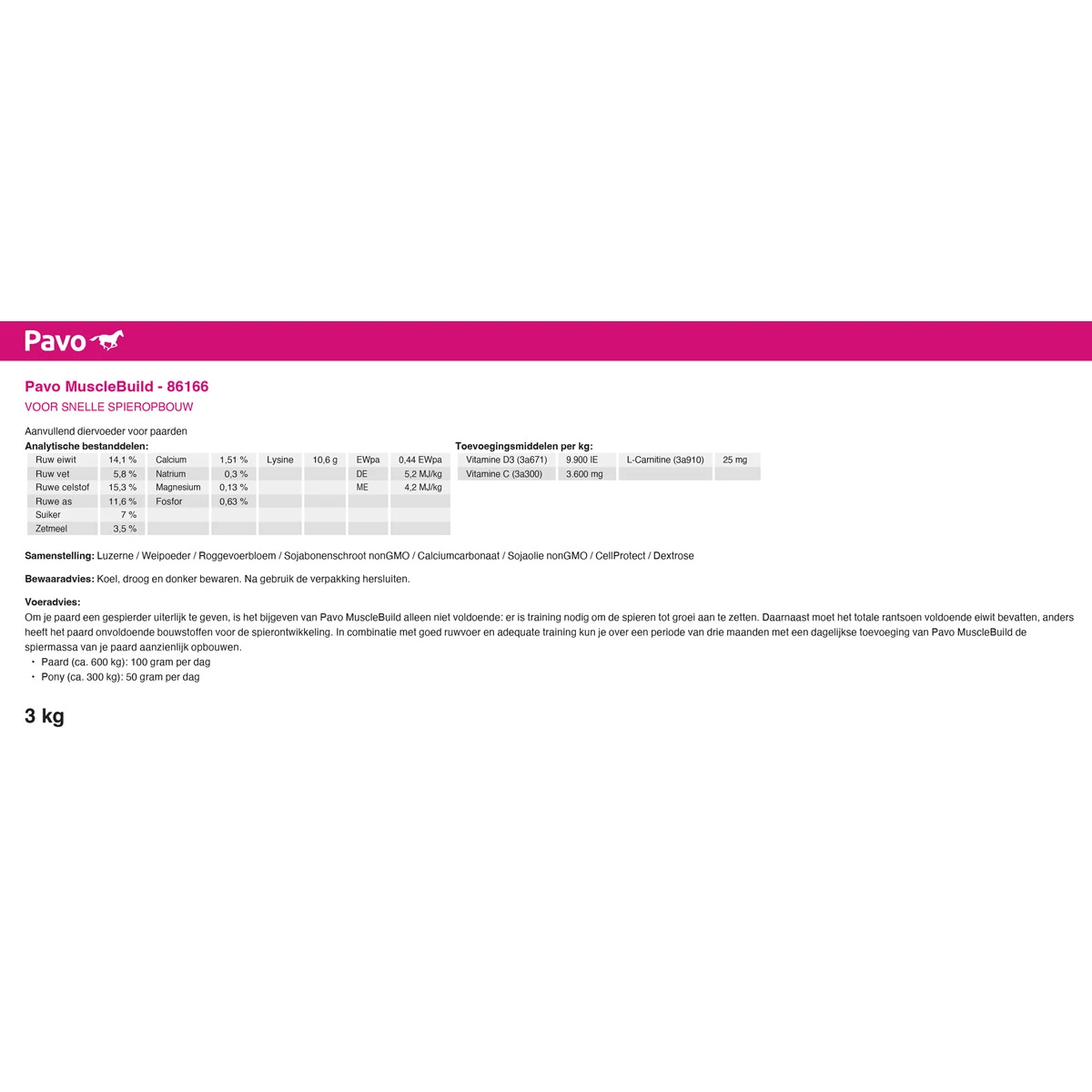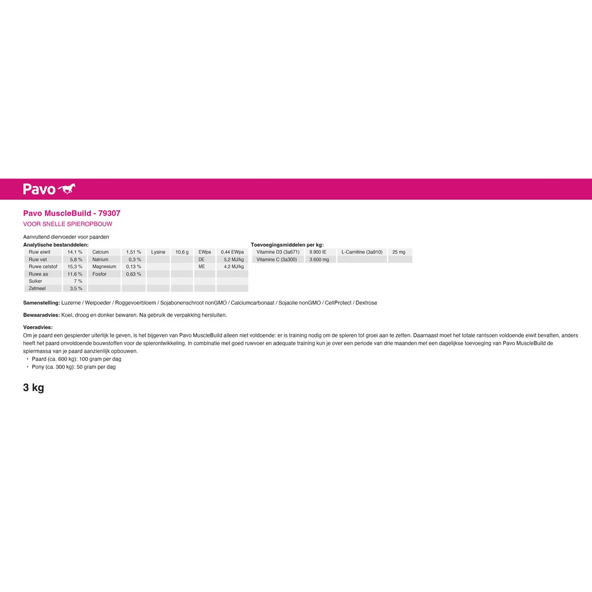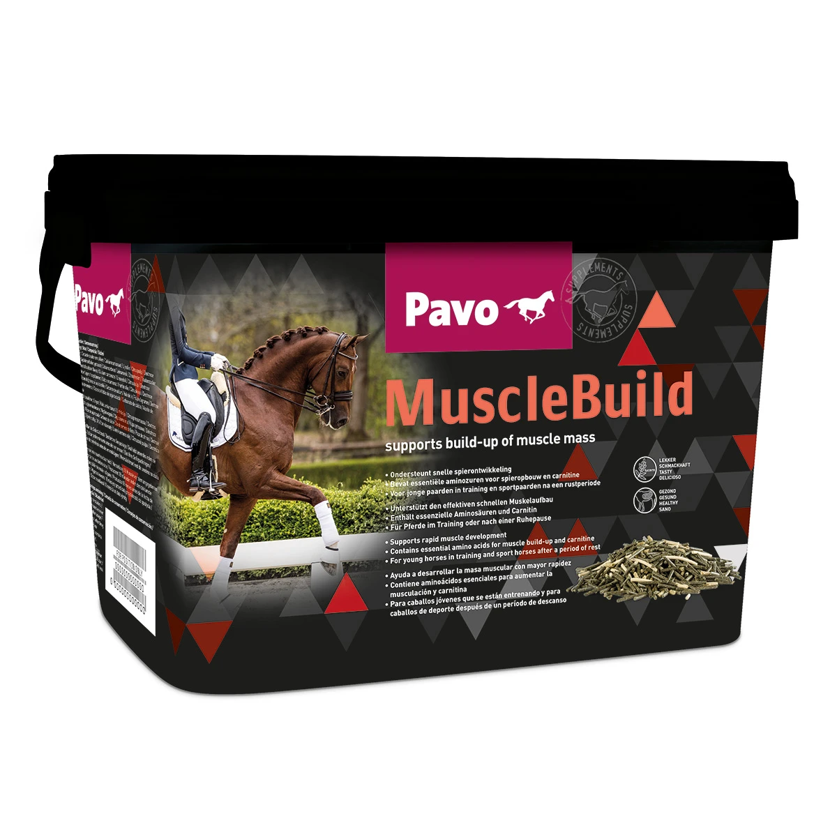 Om je paard een gespierder uiterlijk te geven, is het bijgeven van Pavo MuscleBuild alleen niet voldoende: er is training nodig om de spieren tot groei aan te zetten. Daarnaast moet het totale rantsoen voldoende eiwit bevatten, anders heeft het paard onvoldoende bouwstoffen voor de spierontwikkeling. In combinatie met goed ruwvoer en adequate training kun je over een periode van drie maanden met een dagelijkse toevoeging van Pavo MuscleBuild de spiermassa van je paard aanzienlijk opbouwen.