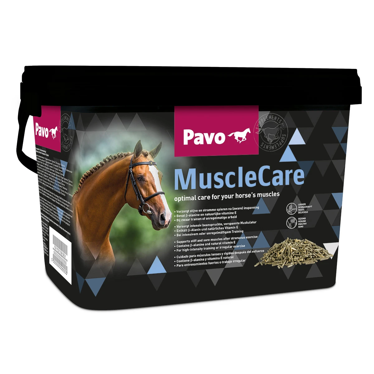 Als je niet weet of jouw paard aanleg heeft voor spierverzuring na zware arbeid, kun je preventief Pavo Eplus geven. Paarden waarvan bekend is dat ze na een inspanning stijfheid en spierpijn hebben, hebben baat bij Pavo MuscleCare. Geef minimaal twee weken vóór de wedstrijd tot een week erna dagelijks Pavo MuscleCare door het voer. Bij zeer gevoelige paarden wordt aangeraden om Pavo MuscleCare over een langere periode te geven.