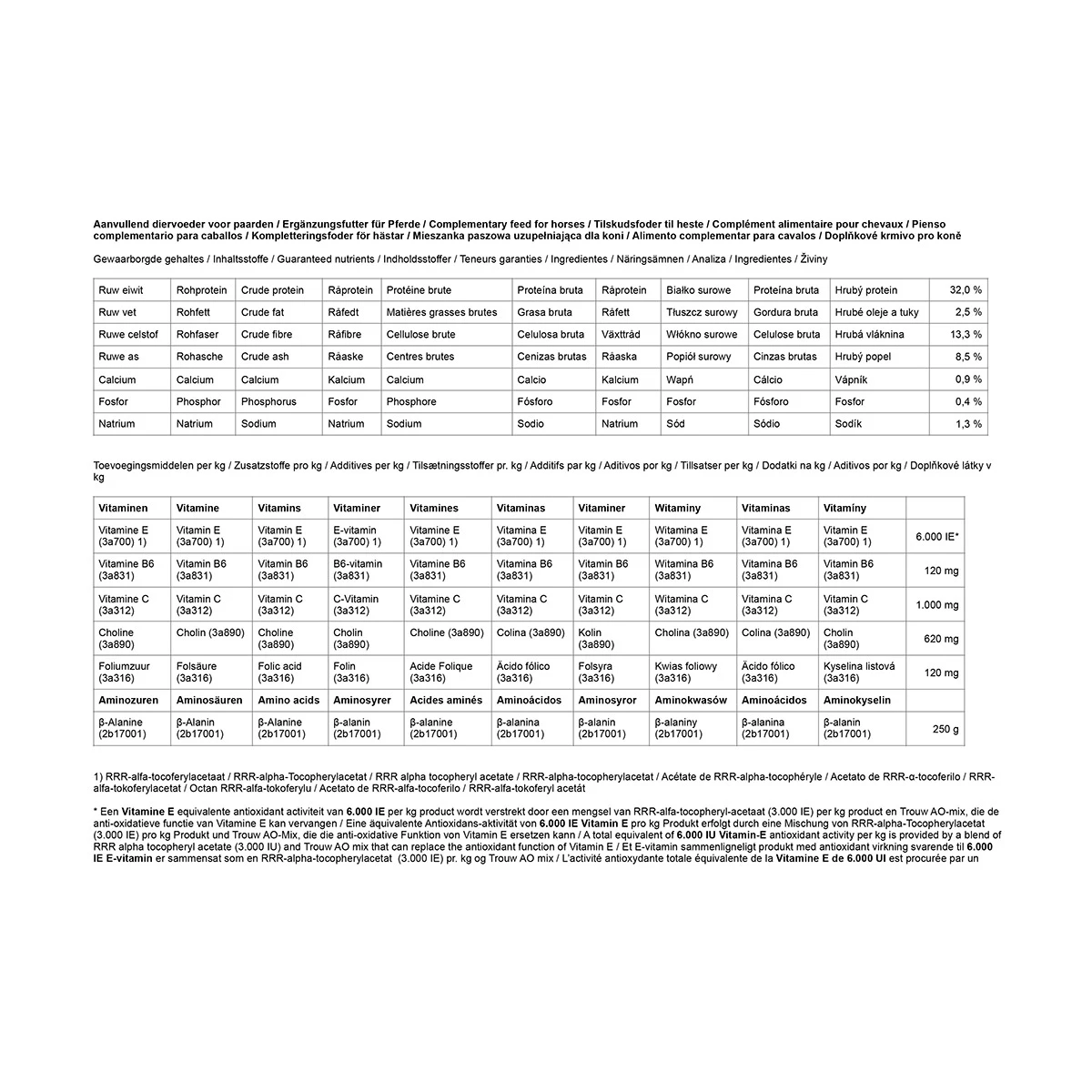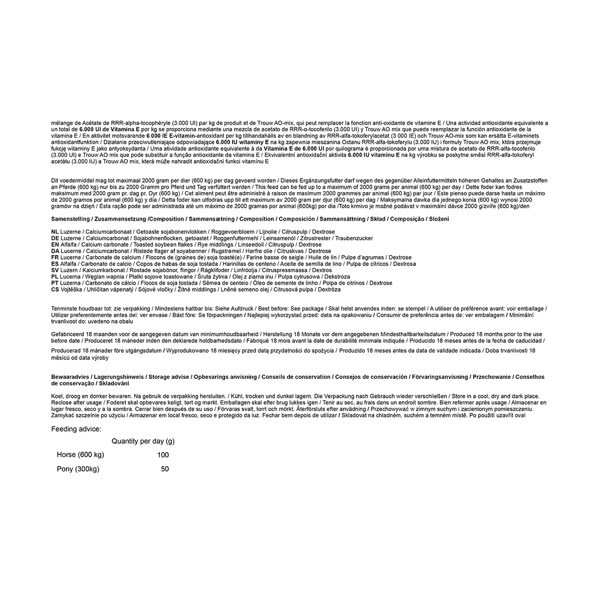 Paarden (ca. 600 kg): 100 gram per dag.