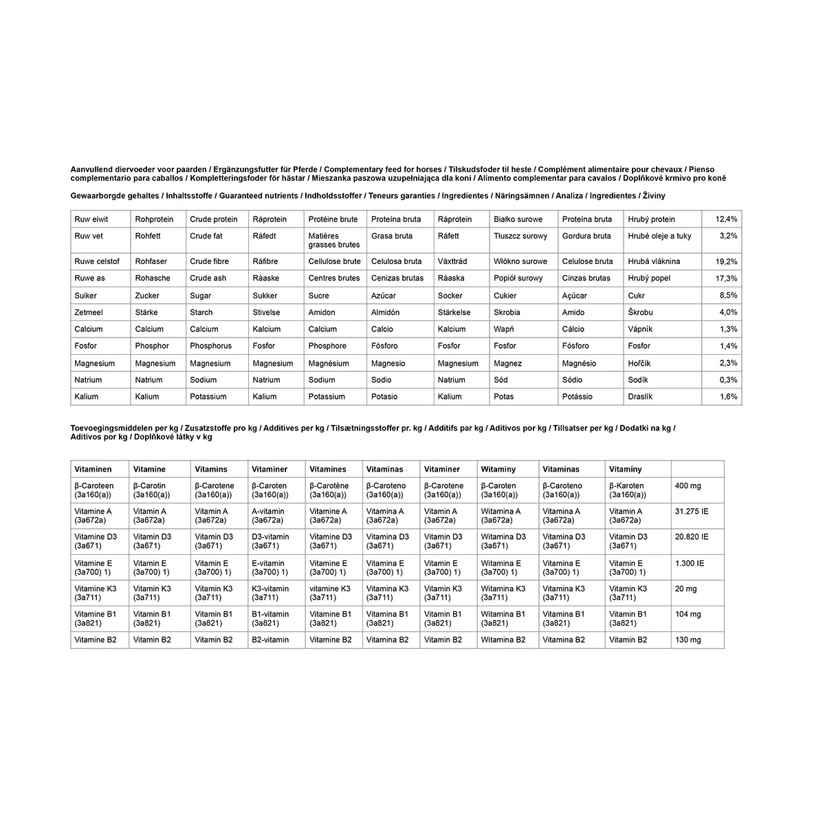 Luzerne, tarwegries, tarwevoerbloem, zonnebloemzaadschroot, lactose, magnesium, fosfaat, palmolie