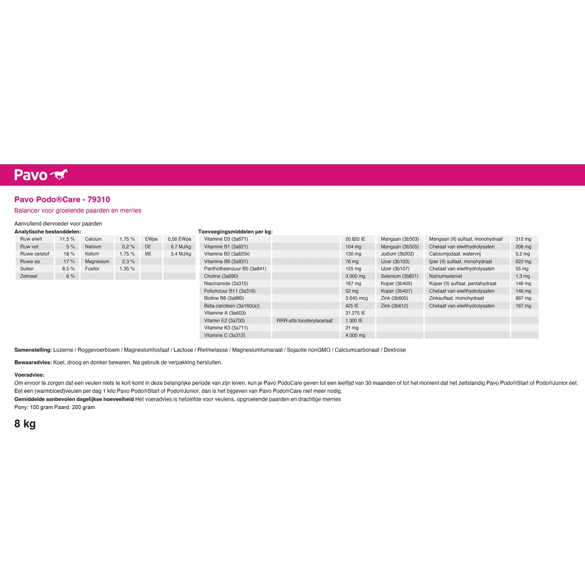 - wanneer je geen krachtvoer uit de Pavo Podo-lijn voert kan je in plaats daarvan Podo Care blijven voeren tot het veulen 30 maanden is of dit supplement combineren met brokken