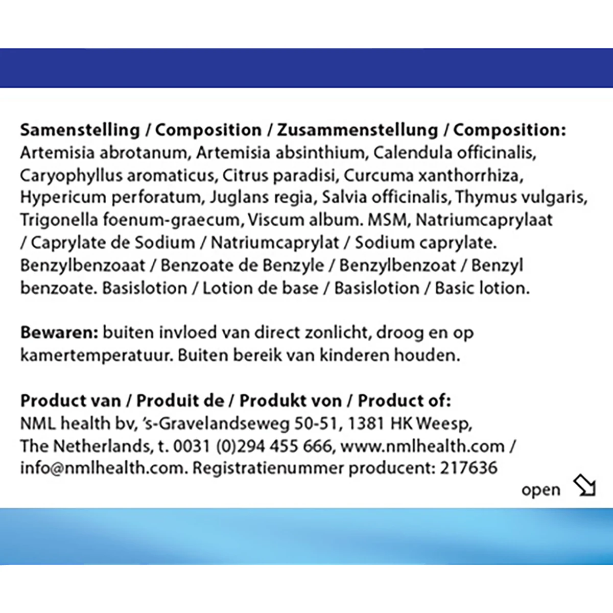 Samenstelling: Een extract van Artemisia abrotanum, Artemisia absinthium, Calendula officinalis, Caryophyllus aromaticus, Citrus paradisi, Curcuma xanthorrhiza, Hypericum perforatum, Juglans Regia, Salvia officinalis, Thymus vulgaris, Trigonella foenum-graecum en Viscum album. Benzylbenzoaat, Natriumcaprylaat en Zwavelbloem. Basislotion.