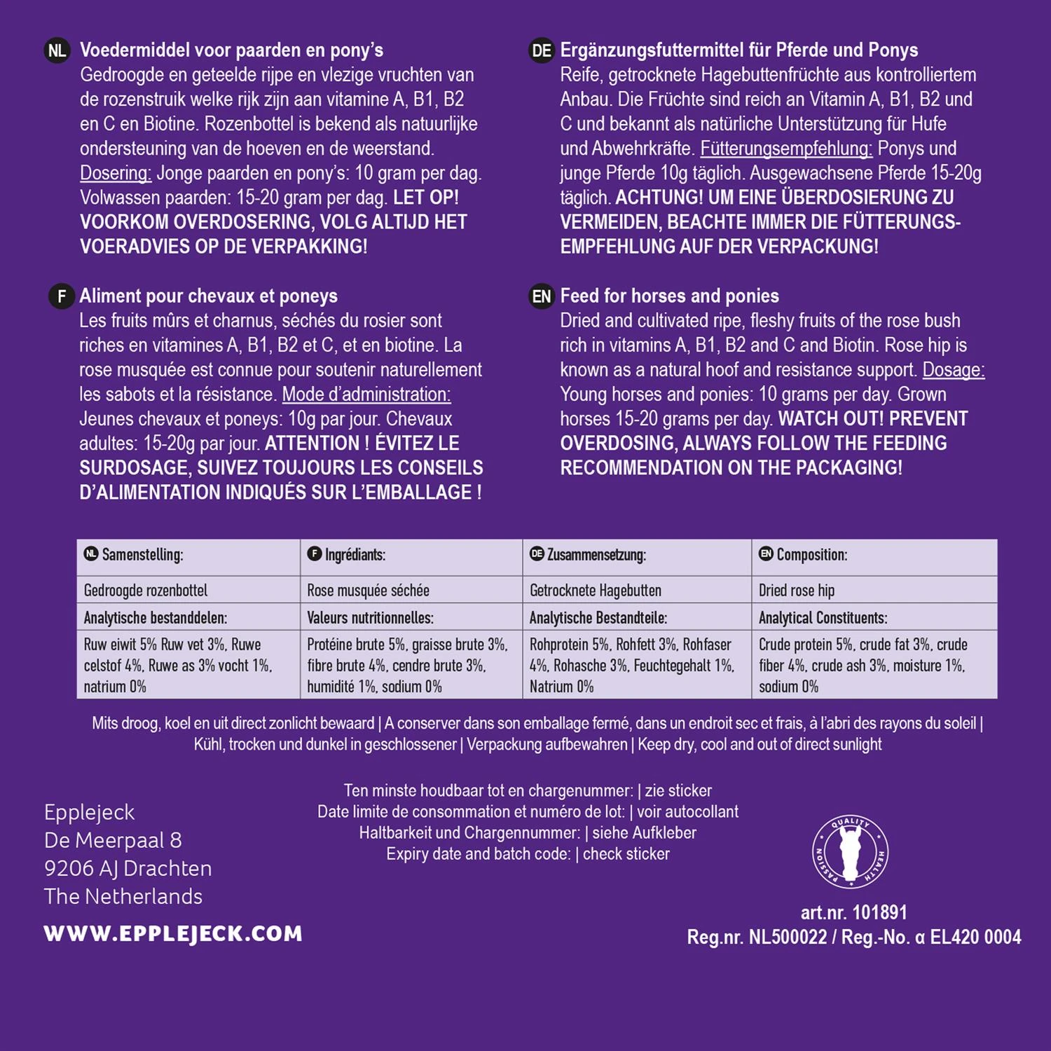 - bevat biotine ter ondersteuning van een gezonde hoefgroei