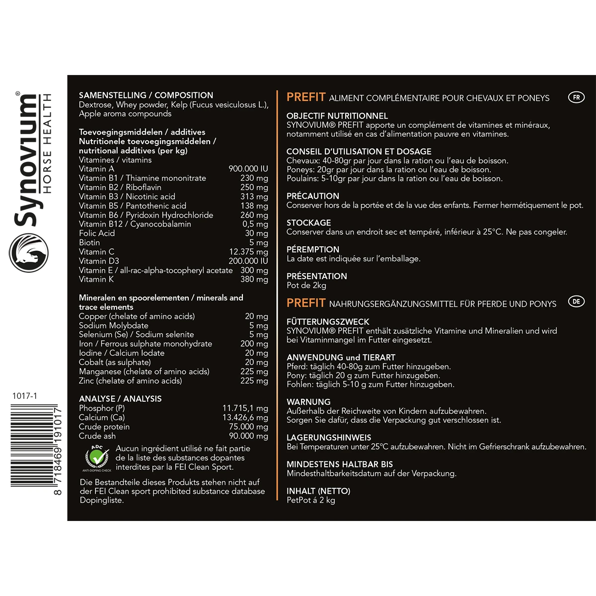 - bevat Vitamine A, Vitamine B, Vitamine B2, Vitamine B3, Vitamine B5, Vitamine B6, Vitamine B12, Foliumzuur, Biotine, Vitamine C, Vitamine D, Vitamine E, Vitamine K, Koper, Natrium, Selenium, Ijzer, Jodium, Kobalt, Mangaan, Zink, Weipoeder, Zeewier, Dextrose