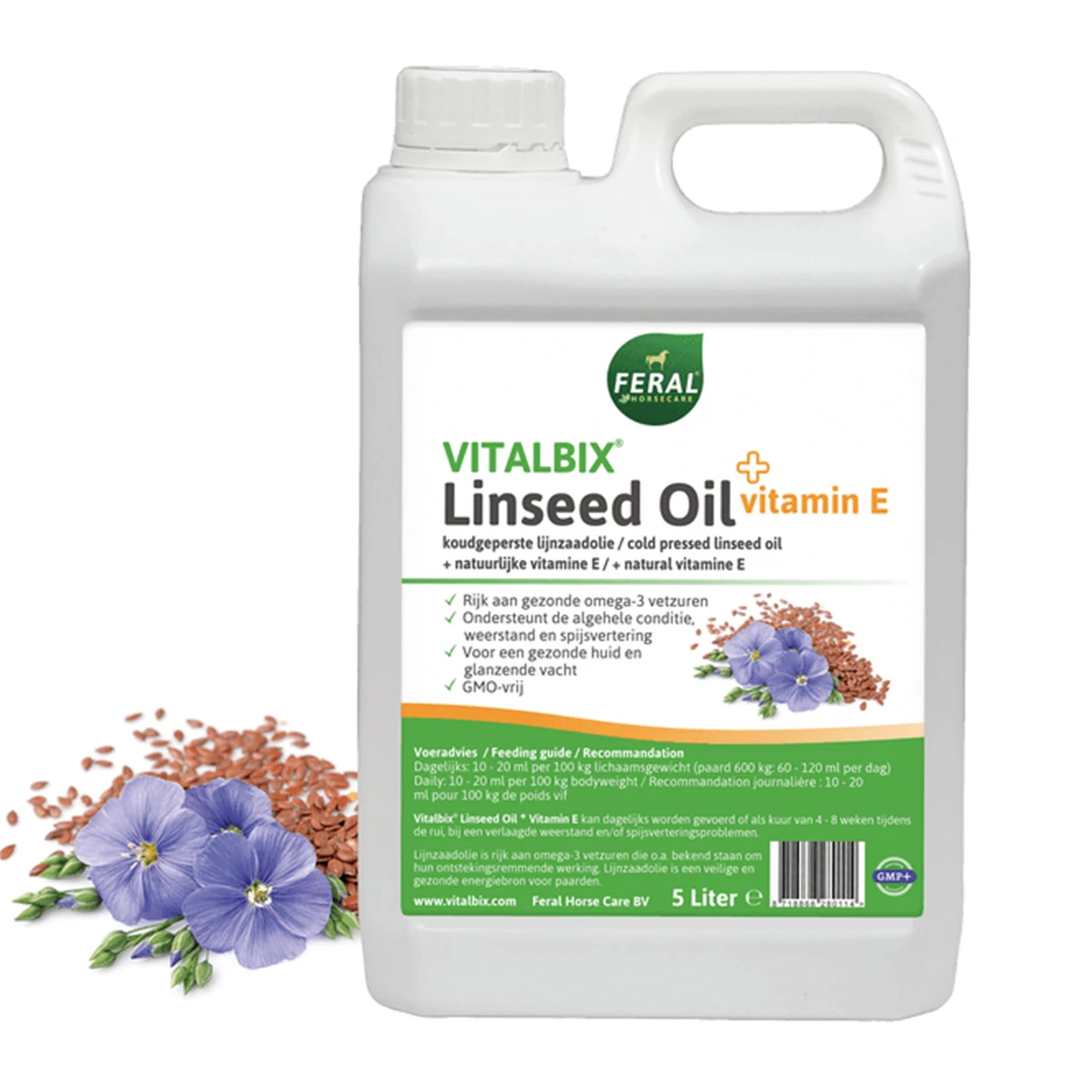 - bij beperkte weidegang: 10 – 20 ml per 100 kg lichaamsgewicht. Een paard van 500 kg voer je 50 – 100 ml per dag